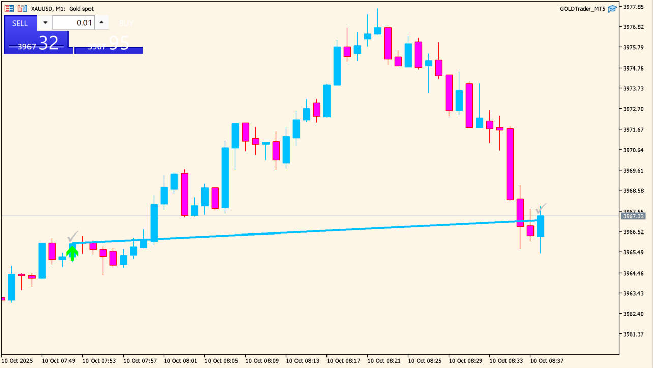 通常、MT5ではポジションを決済した後にエントリーポイントが表示されますが、TradeArrow_MT5ではリアルタイムでエントリーと決済が反映されます。そのため、裁量トレードでもEAでもトレード中の動きをその場で確認できます。