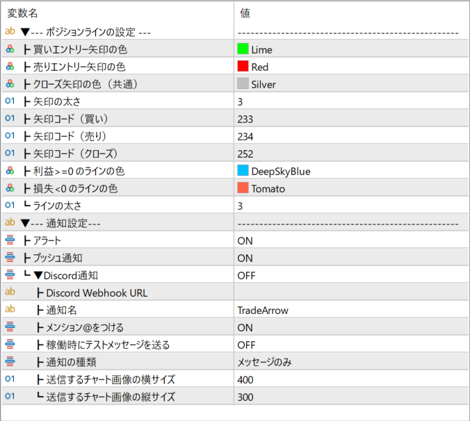 パラメーターはポジションラインの設定については、変数名がそのまま説明になっていますので割愛します。矢印のコード番号についてはこちらを参考にして下さい。